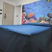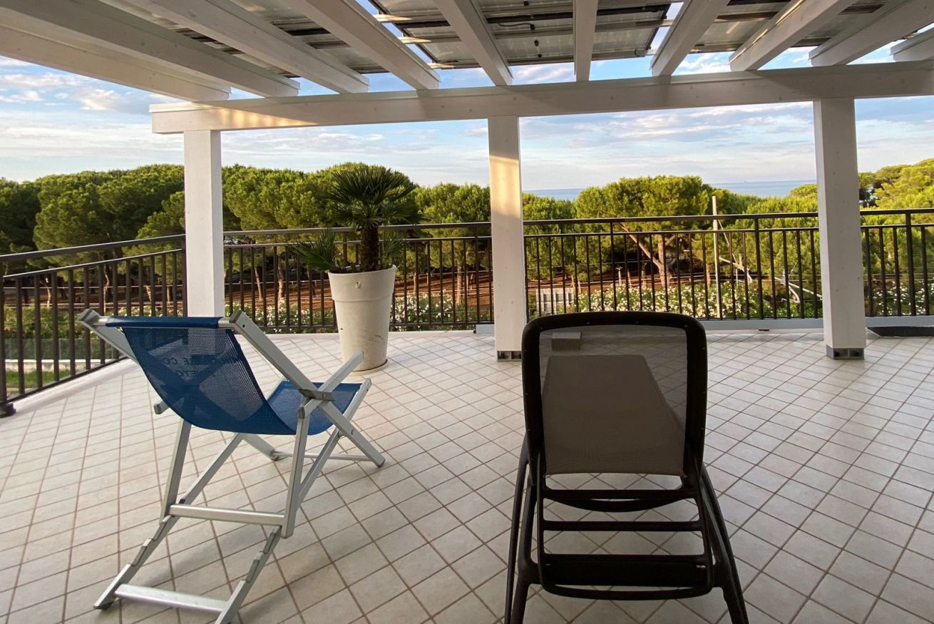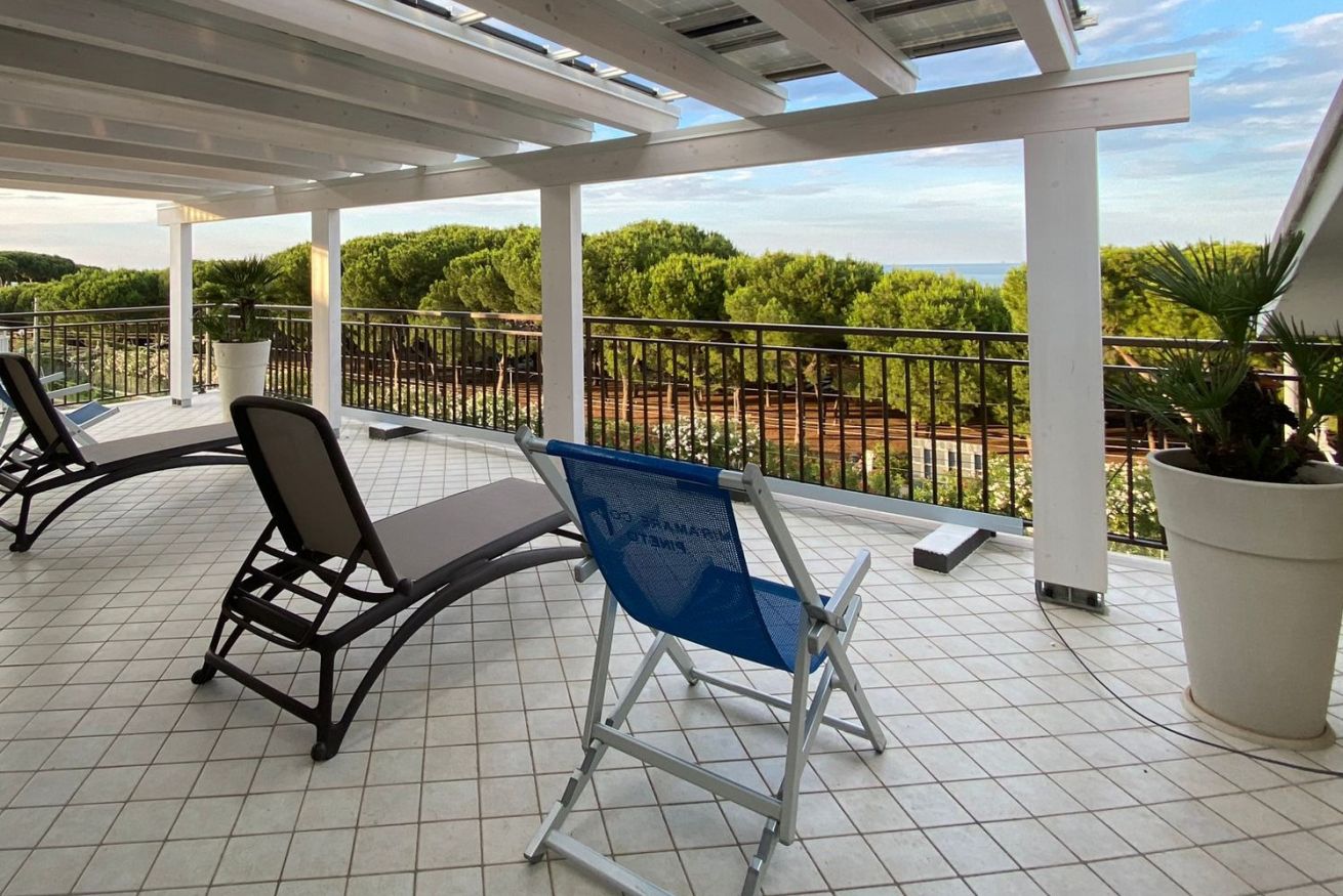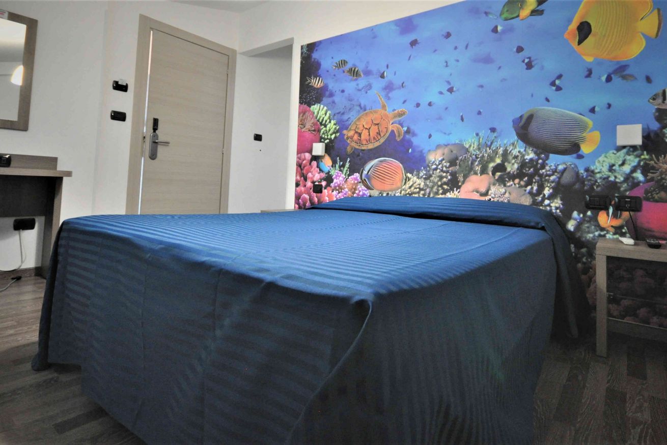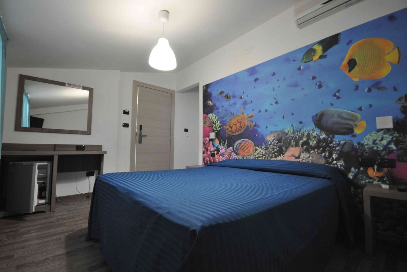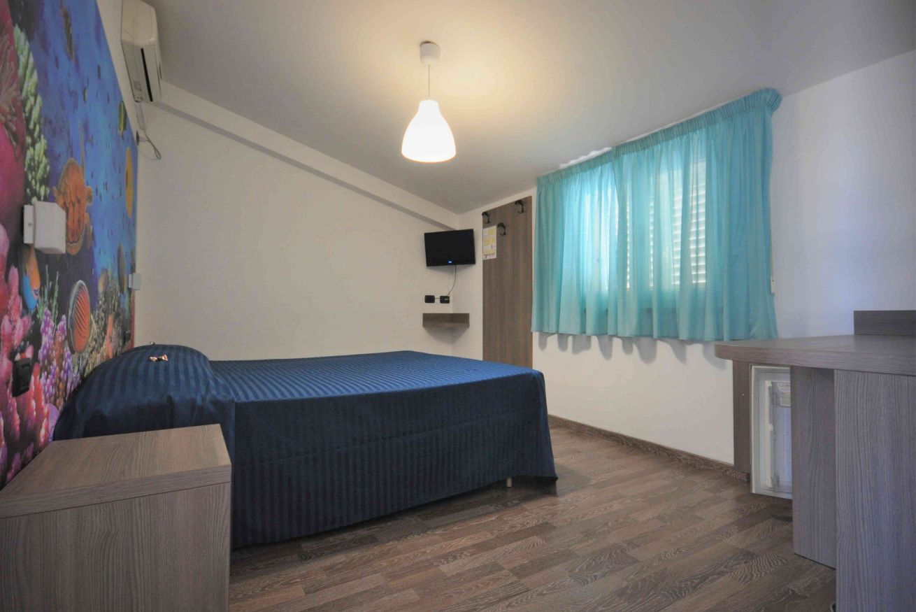 Camera matrimoniale di mq 14 con letto matrimoniale o 2 letti singoli (se prenotata anticipatamente). Bagno con finestra. Terrazzo di mq 33 in comune con un'altra stanza, corredato con ombrelloni, sdraio e lettini. Fronte mare.