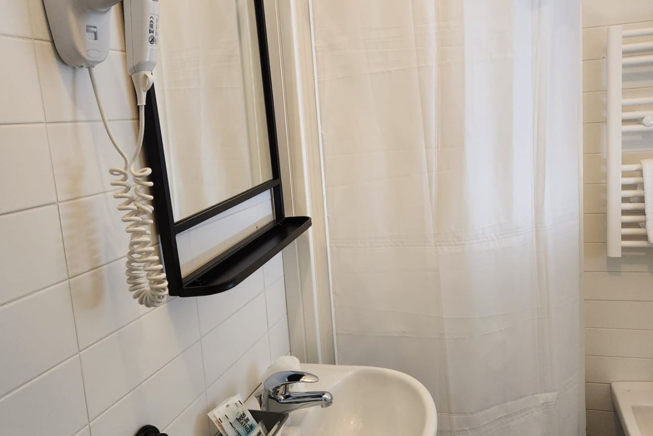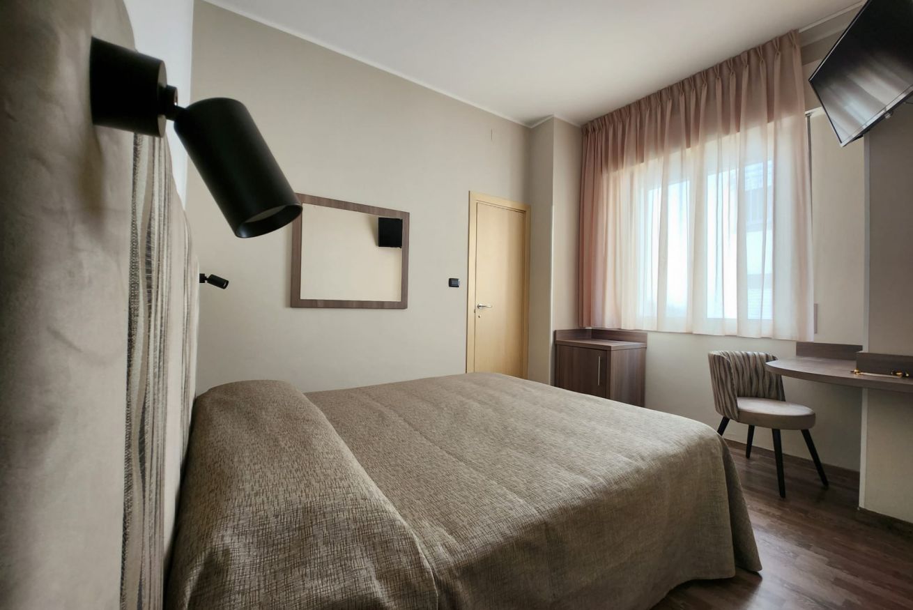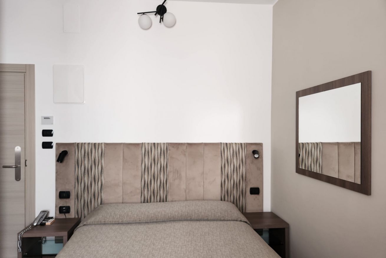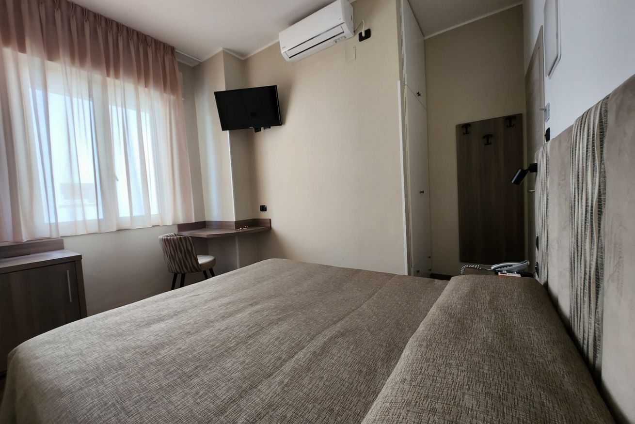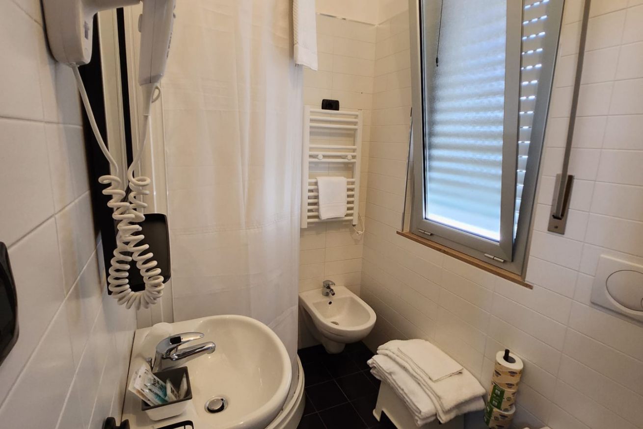 Camere di mq 12. Letto matrimoniale o 2 letti singoli (se prenotata anticipatamente). Vista laterale. Bagno con finestra.